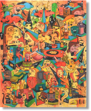 Avec ses teintes chaudes de rouge, d’ocre et d’orangé, La gracia es para todos de Boris OA, mêle une densité de formes et de visages qui se superposent comme un camaïeu automnal. Ces couleurs vibrantes, adoucies par des nuances de brun et de jaune, traduisent l’énergie de la saison comme un moment collectif, ouvert et vivant, où la grâce évoquée par l’artiste se partage avec tous.