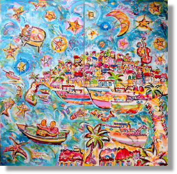 La nuit de rêve déploie une vision onirique de Sète, où la mer, la ville et le ciel se confondent dans un tourbillon de couleurs. Les bateaux, les maisons méditerranéennes et les palmiers évoquent le port et ses rivages, tandis que les étoiles et la lune ouvrent l’imaginaire vers une dimension poétique. Sète, marqué par une lumière douce et des cieux changeants, trouve ici une résonance : la ville se fait paysage intérieur, vibrant et lumineux, où le quotidien se teinte d’irréel.