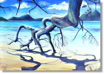 Dans cette toile d’Em’Ji, la frontière entre ciel et eau se rassemble dans un éclat de bleu lumineux. Les montagnes lointaines se fondent dans l’horizon tandis que l’arbre aux racines sculpturales s’avance vers la mer, comme suspendu entre terre et lagon. L’œuvre capture cet instant fragile où la nature dialogue avec la lumière, entre profondeur marine et ciel ouvert.