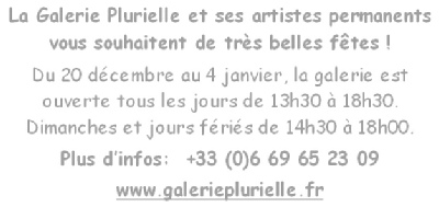 Accès aux catalogues de la Galerie PLURIELLE La Galerie PLURIELLE  sur LinkedIn La galerie PLURIELLE sur FaceBook La galerie PLURIELLE sur Instagram La galerie PLURIELLE sur YouTube Art-i-Show de NOËL Marie-Aude MOLIN Baptista ANTUNES Sabine LOURIAC Mike JACOBS PATOPALOMO EVA KR Max ARTLOUIS MARCO Les catalogues de la Galerie PLURIELLE
